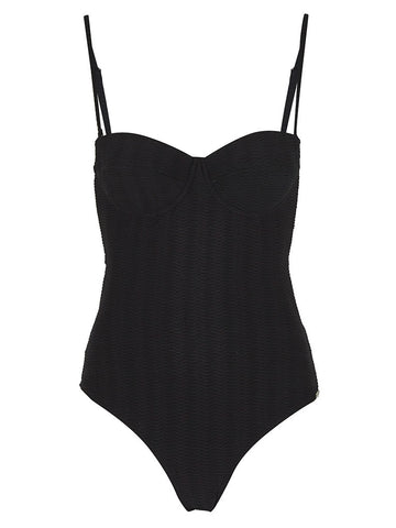 A soft white base swim fabric with a vertical black wavy line throughout. The fabric features slightly raised white accents creating a 3D wavy look. The swim is complimented by a thin white lining.