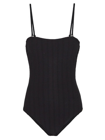 This textured black sheer swim fabric with a 3D horizontal wavy line design is completed with black lining providing solid coverage.