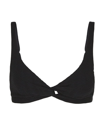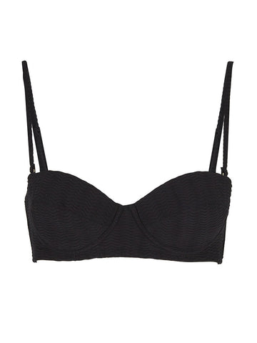 This textured black sheer swim fabric with a 3D horizontal wavy line design is completed with black lining for solid coverage.