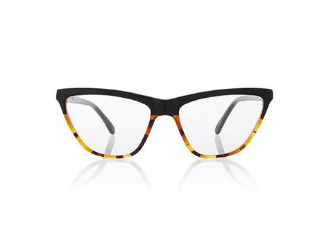 Two tone frame with a solid black acetate following the brow and the temple changing to an amber colour tortoiseshell.