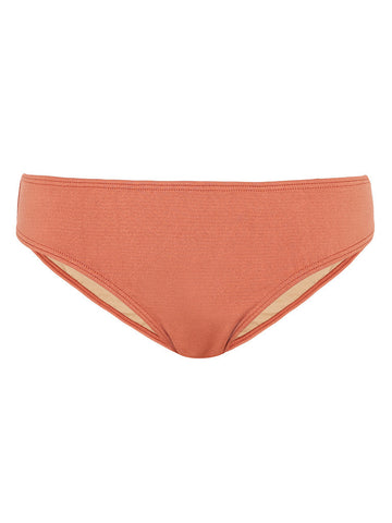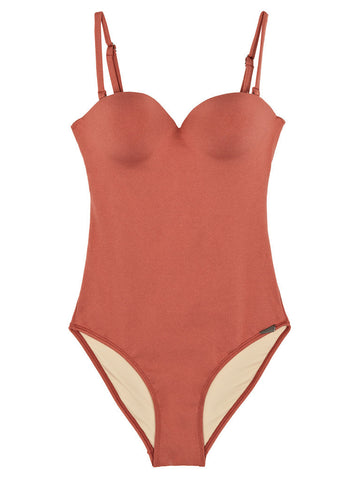 This thick luxurious smooth rosy orange swim fabric features a slight sheen and subtle nude lining.