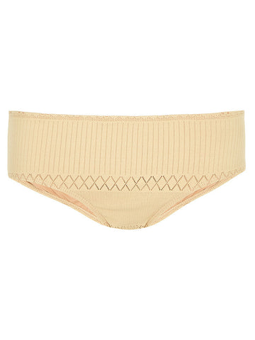 This textured cream sheer swim fabric has a 3D horizontal design and is complimented with a nude lining.