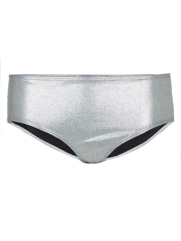 A thick stretch metallic silver swim fabric with a smooth finish and black lining.