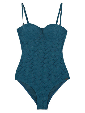 A deep teal colourway with geometric cut out motif in a woven fabric and lined with a matching colour giving it a deep textured look.
