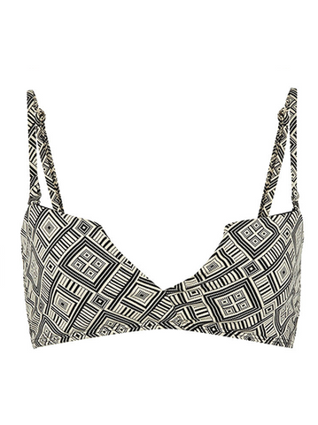 A soft thick matte nude swim fabric with repetitive black geometric print throughout. Featuring black lining for a sophisticated finish.