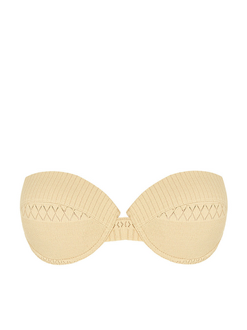 This textured cream sheer swim fabric has a 3D horizontal design and is complimented with a nude lining.