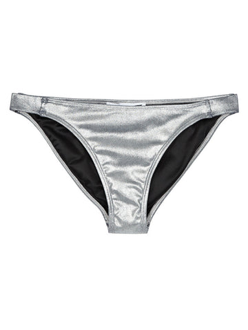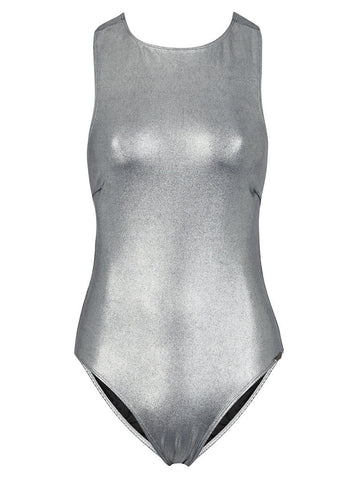 A thick stretch metallic silver swim fabric with a smooth finish and black lining.