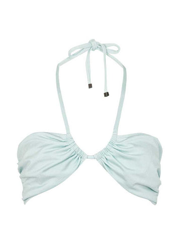 This thick luxurious smooth baby blue swim fabric features a slight sheen and subtle nude lining.