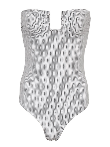 • A soft white base swim fabric with a vertical black wavy line throughout. The fabric features slightly raised white accents creating a 3D wavy look. The swim is complimented by a thin white lining.