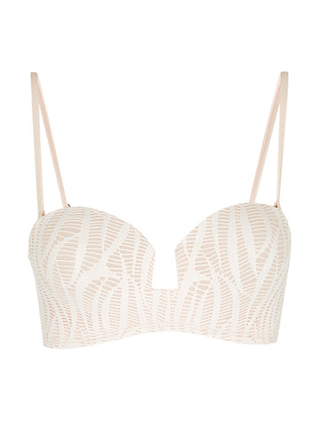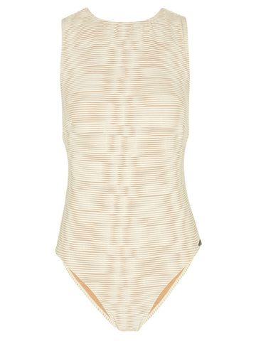 • This textured cream sheer swim fabric has a 3D horizontal design and is complimented with a nude lining.