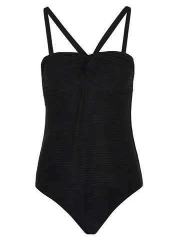 • This textured black sheer swim fabric with a 3D horizontal wavy line design is completed with black lining providing solid coverage.