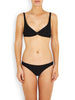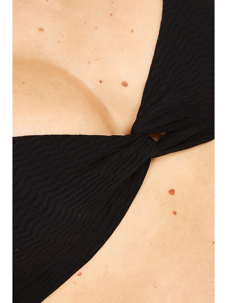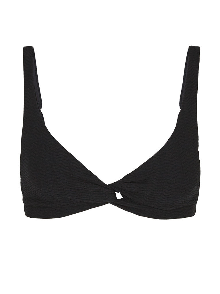 The Buzios bikini top is a 70s sporty shape finished with a twist-knot front and a low back, this shape works well for all cup sizes. With a soft triangle style cup, the top offers good support with a medium amount of coverage. The straps are adjustable and fixed at the back with a gunmetal hook and fabric fastening at the center back.