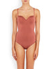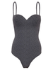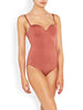 A classic feminine style with a smooth, sculpted silhouette. This style is suitable for those with medium to larger cup sizes. The moulded underwire cups and built in padding offers additional support with a subtle lift. The bust size can seem a little large due to nature of cup so we suggest advising the customer to size down if it is an issue. There are no fastenings but the solid front and covered back offer great support and coverage. The leg is cut high with a medium bottom coverage and it has detachable straps to provide additional support.