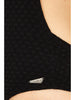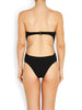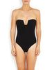 This strapless swimsuit features a U bar detail across the chest a style more suitable for smaller busts. The open back is finished off with a gunmetal hook and fabric fastening and does not come with straps. The legs are high cut but offer a medium amount of bottom coverage.