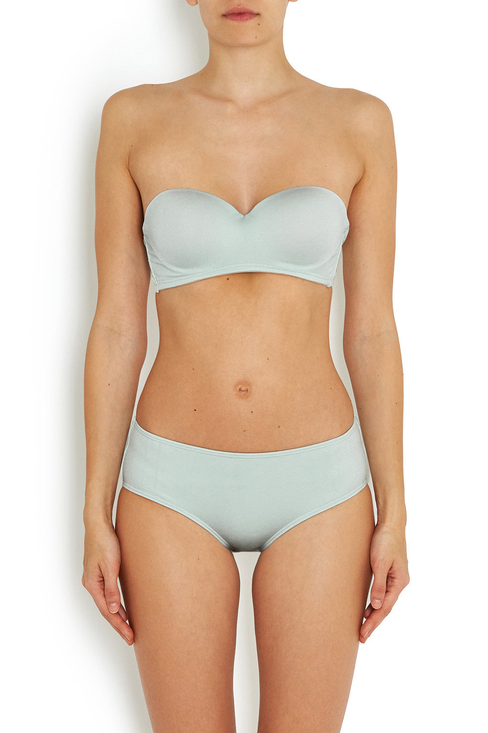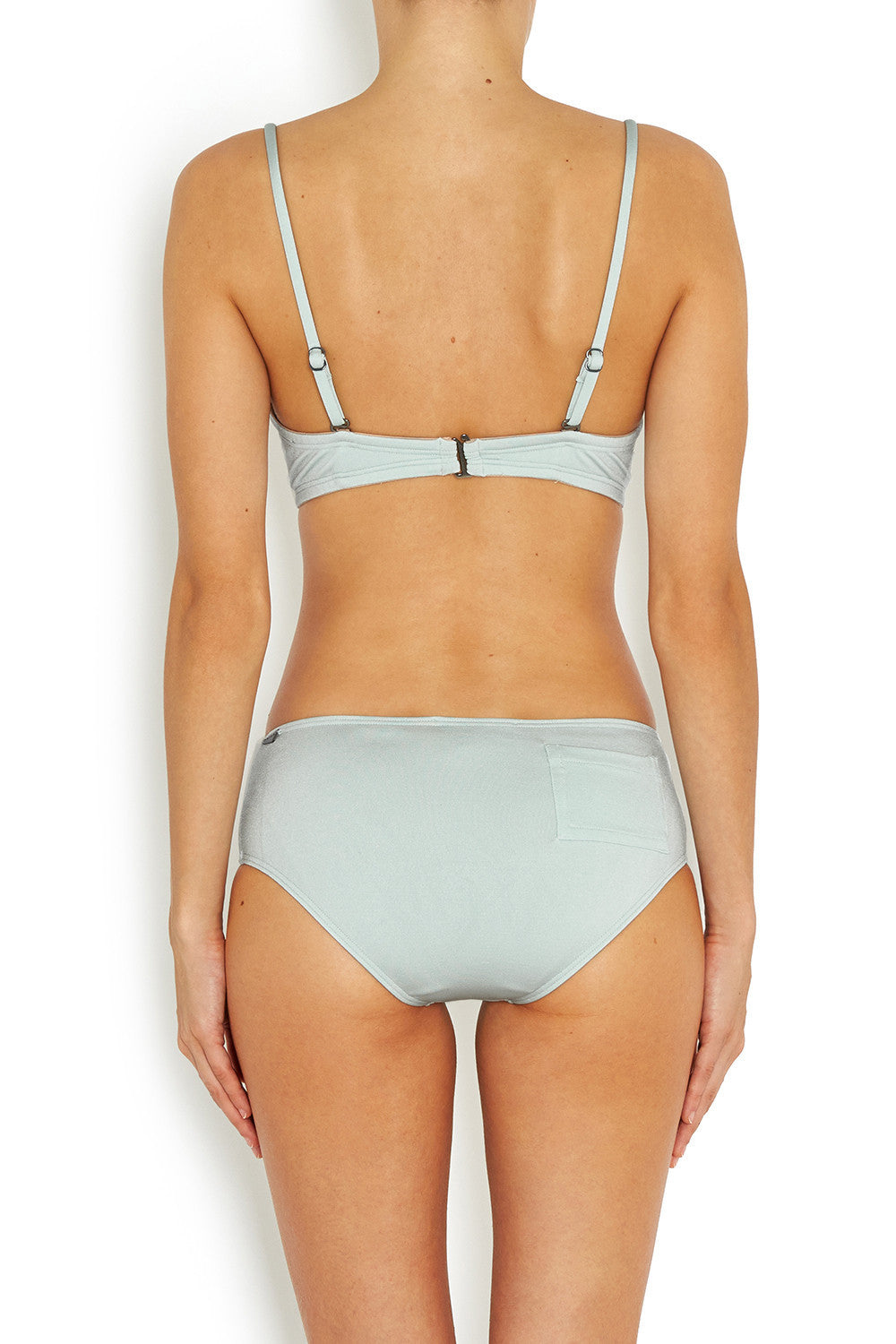 The Sophisticated Montauk bikini top is ideal for medium to larger cup sizes. The moulded cup with underwiring and built in padding offers additional support with a subtle lift. The Montauk can seem a little large due to nature of cup so we suggest advising the customer to size down if it is an issue. The straps are adjustable and removeable. There is a gunmetal hook and fabric fastening at the center back