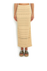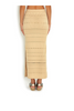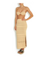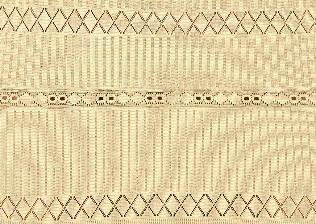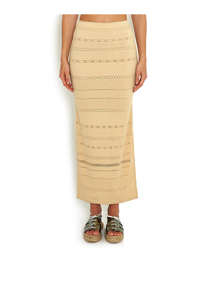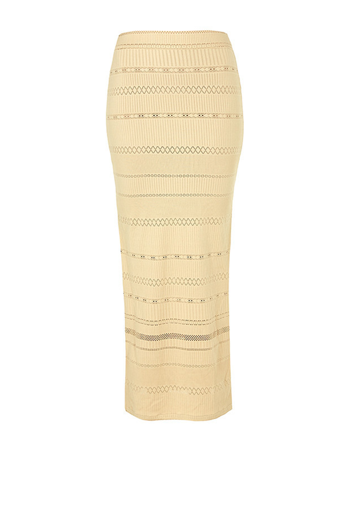This new piece is a must for your holiday wardrobe, seen here in a comfortable stretch material in a sandy hue with a geometric cut-out motif. This piece can be worn as a long floor length skirt, with slits down the side or as a strapless three-quarter length pull-on dress; perfect as a multifunctional holiday piece.