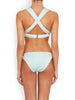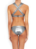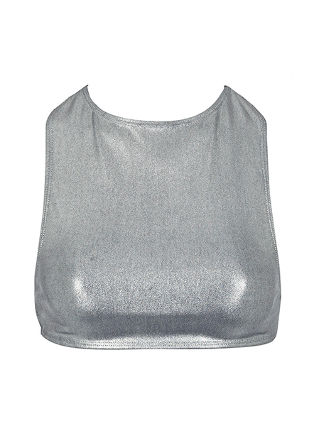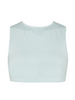 This sporty crop top style is suitable for smaller busts. With full coverage and high neck front the top reveals an open cross strap back with gunmetal hook and fabric fastening at the center. These straps are fixed and cannot adjust.