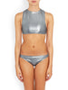 • A thick stretch metallic silver swim fabric with a smooth finish and black lining.