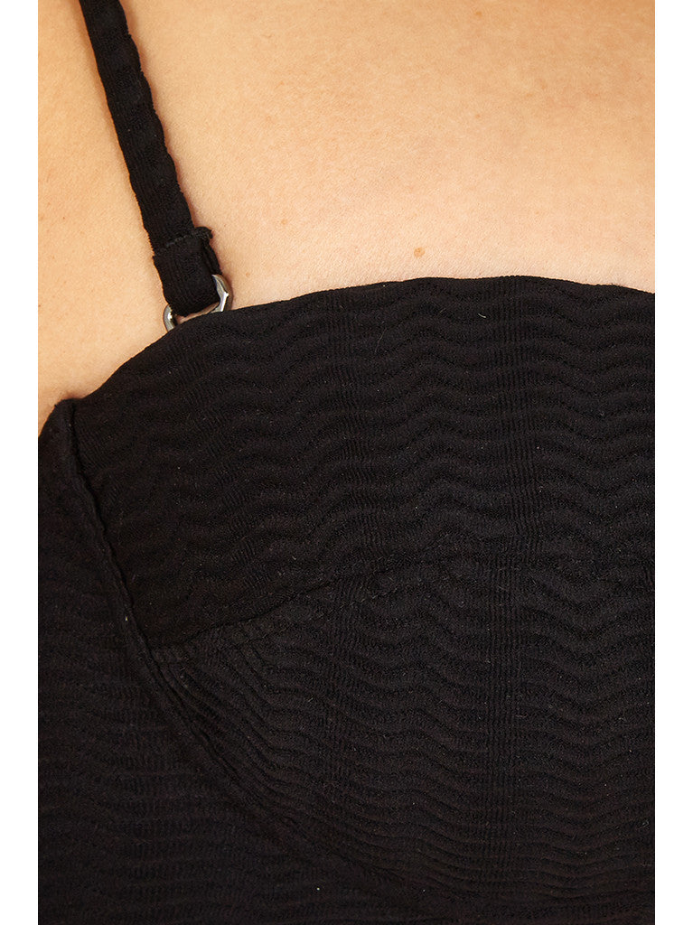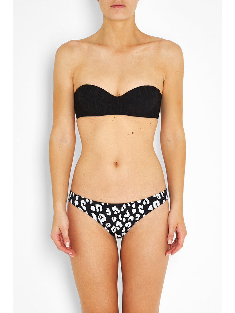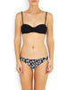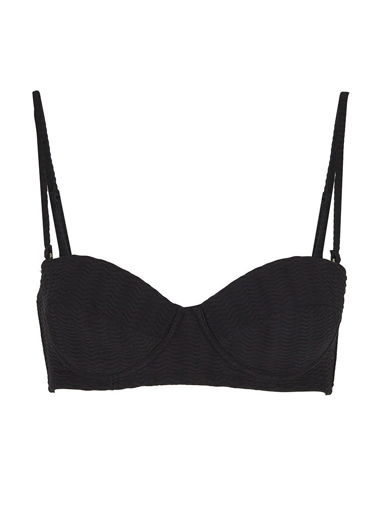 With a 1960s vintage feel, this structured bikini top is perfect for beach lounging. Designed with a bandeau shape, removable straps and underwiring, it is ideal for a medium sized bust. The underwiring and firm cups offer additional lift and support. The large signature PRISM gunmetal clasp at the center back of the top adds a unique touch.