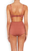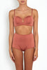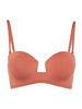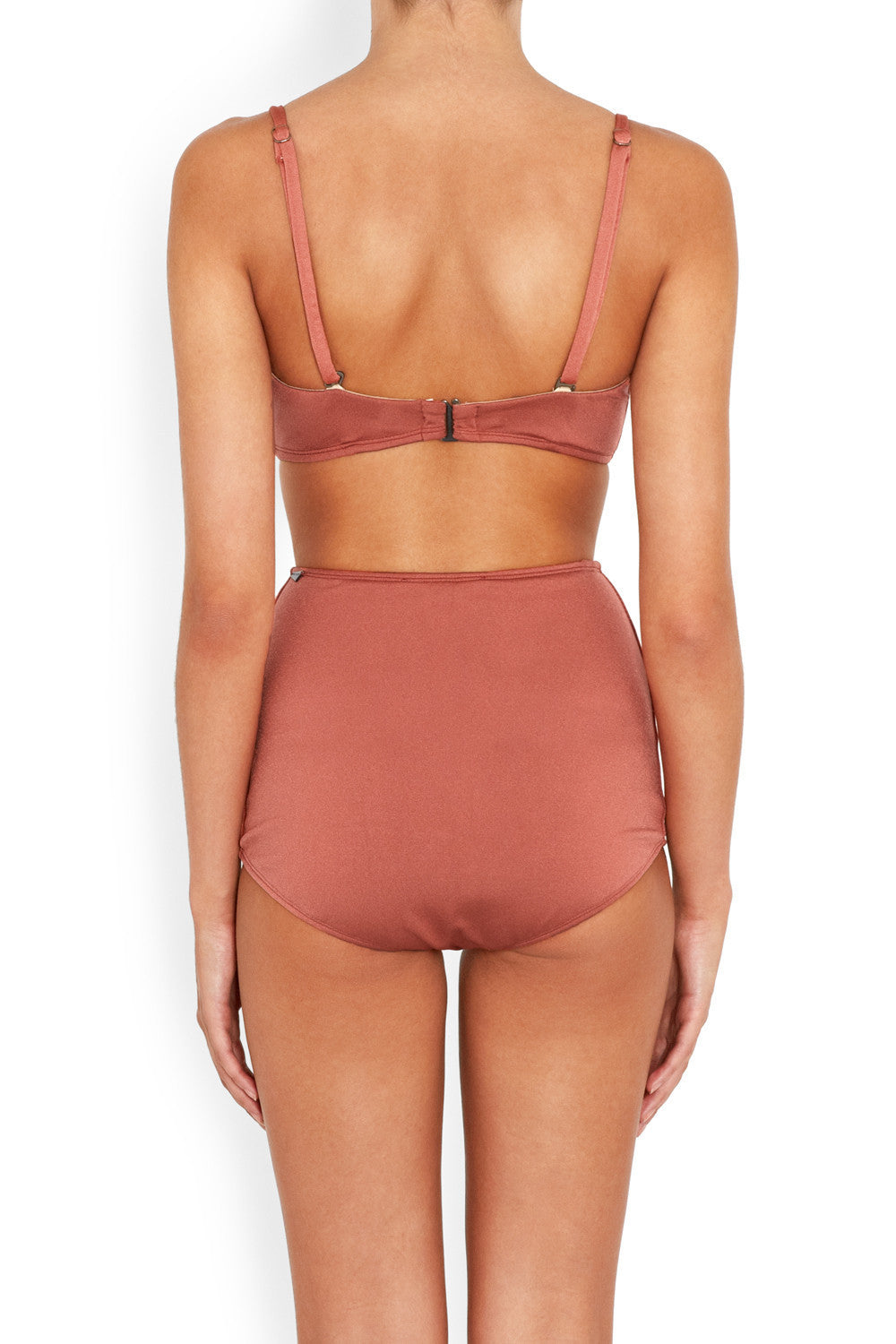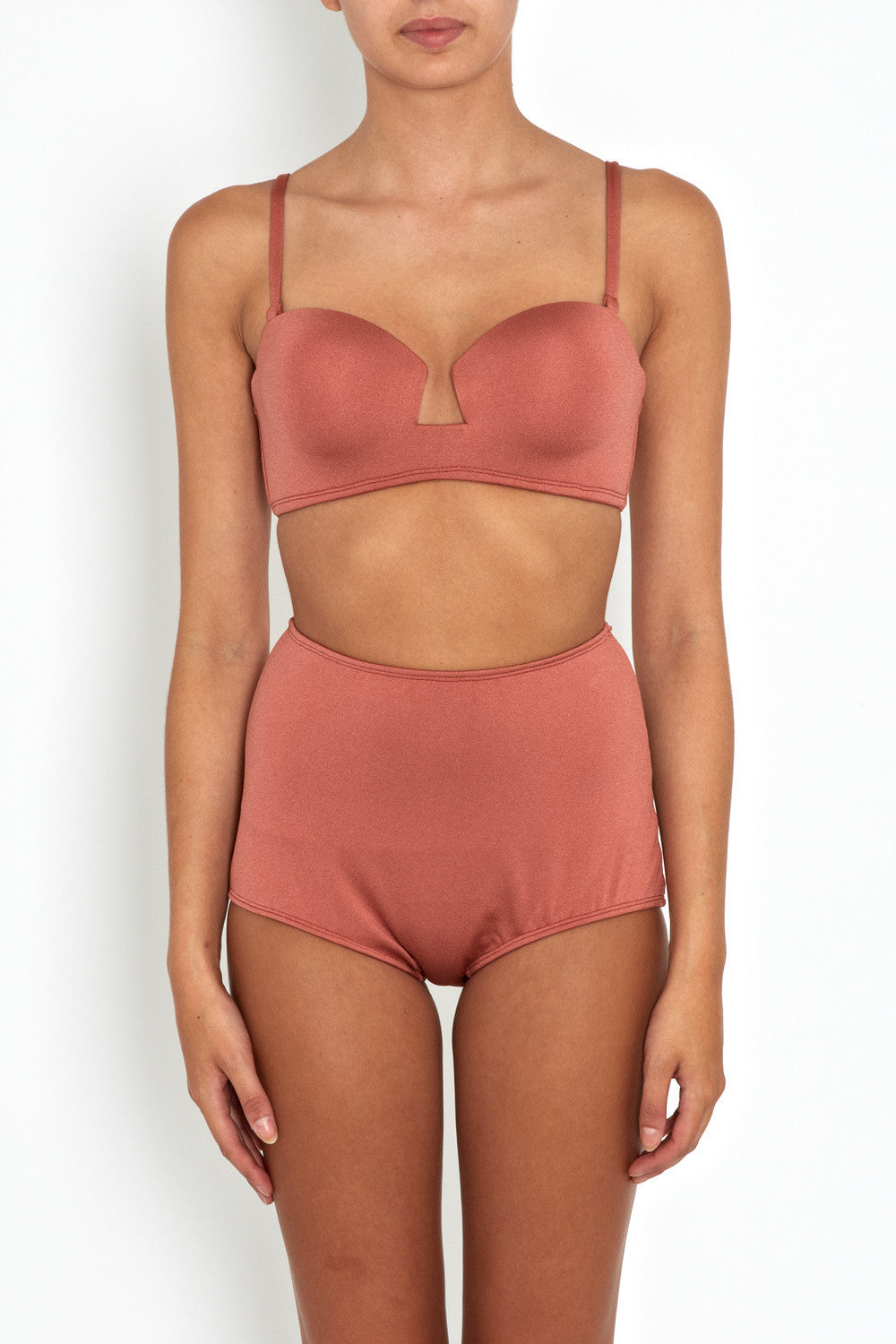 This structured yet elegant bikini top is the perfect style for medium to larger busts. The moulded cup with underwiring and built-in padding offers additional support with a subtle lift. The angular cut-out at the center reveals a little more skin than the Montauk. The Praslin can seem a little large due to nature of cup so we suggest advising the customer to size down if it is an issue. The straps are adjustable and removeable. There is a gunmetal hook and fabric fastening at the center back.