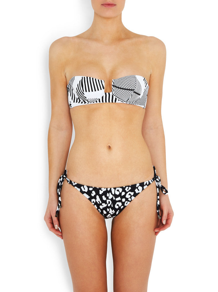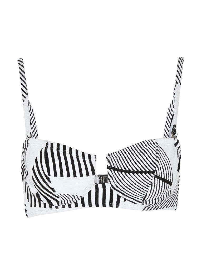 Opt for a modern sleek look with the Rockaway bikini top. Contoured to fit the shape of your body, this soft cup bra-like bandeau is suitable for medium bust sizes, the underwire and cut-out detailing are very flattering and functional, offering a slight lift. The straps are adjustable and removable. The top is finished off with a PRISM signature gunmetal clasp at the center back.