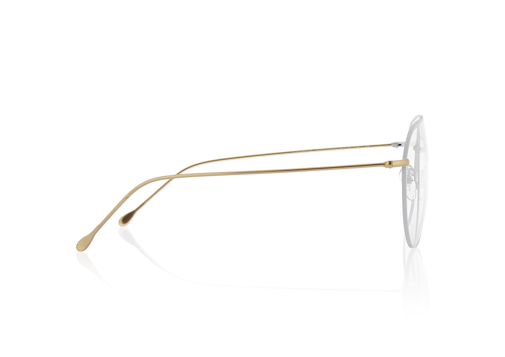 • A transparent acetate with contrasting matte dark brown tortoiseshell temples.