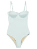 • This thick luxurious smooth baby blue swim fabric features a slight sheen and subtle nude lining.