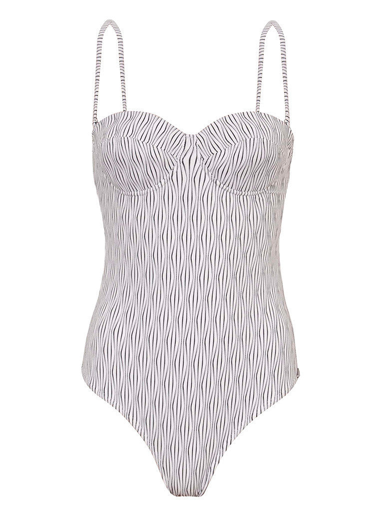 • A soft white base swim fabric with a vertical black wavy line throughout. The fabric features slightly raised white accents creating a 3D wavy look. The swim is complimented by a thin white lining.