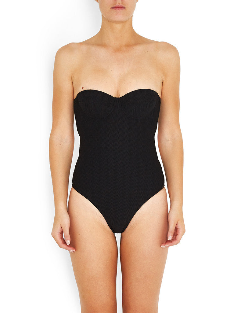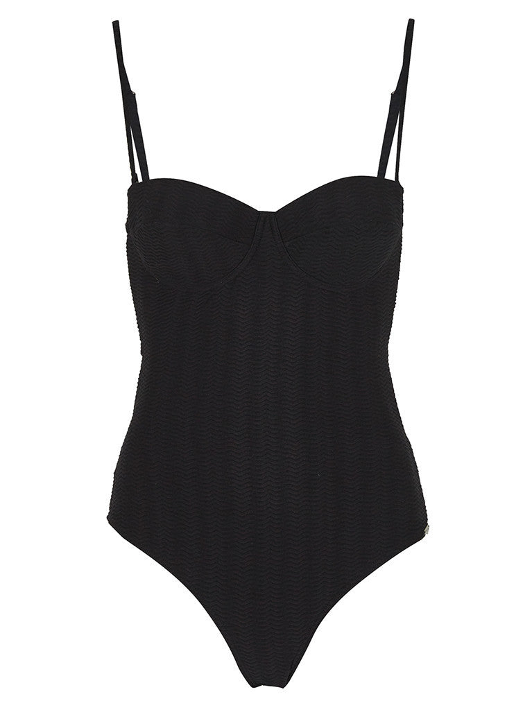 • This textured black sheer swim fabric with a 3D horizontal wavy line design is completed with black lining providing solid coverage.
