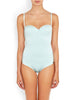 • This thick luxurious smooth baby blue swim fabric features a slight sheen and subtle nude lining.