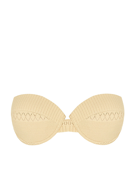 St Tropez is the fashionable little sister to the Positano. This bandeau style is great for those with smaller cup sizes. The underwire and firm cups offer support and can disguise those with a smaller bust but has less coverage than the Positano. This style does not come with straps. There is a gunmetal hook and fabric fastening at the center back.